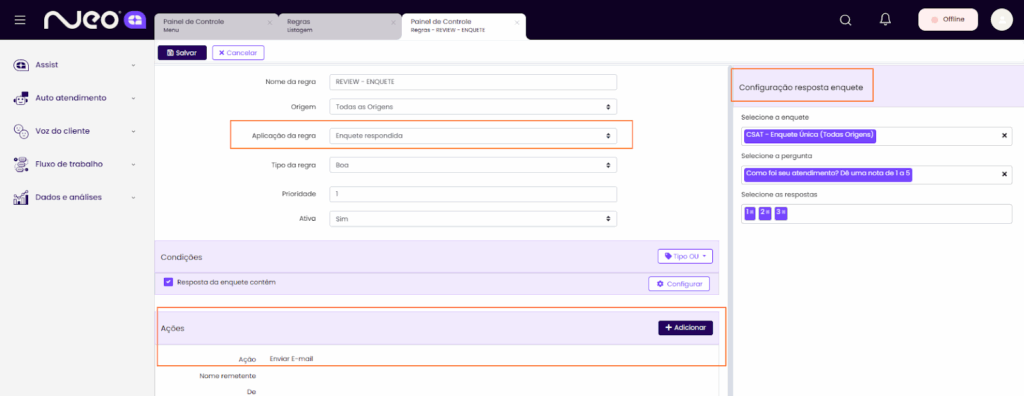 Agora é possível criar uma regra para receber um e-mail quando um cliente avaliar a enquete de forma negativa.